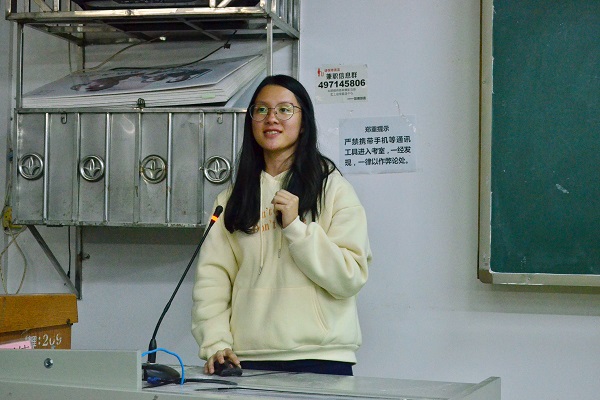 青创部部长陈楚妍介绍活动背景及三位主讲人,三位主讲人依次上台为同学们答疑解难。