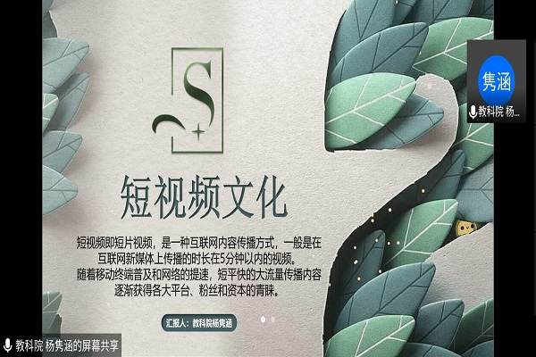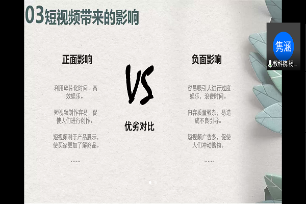 杨隽涵从讲解概念出发,结合大数据分析了当下各大短视频软件的发展现状。同时,她还结合实际生活的例子分析了“短视频”带来的双面影响,并总结出正确使用“短视频”的具体办法,例如合理把控时间、摒弃杂乱平台等。而后,参会的评论员们展开了关于“短视频”的相关讨论。