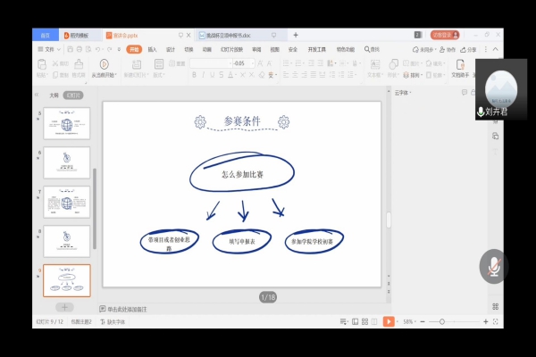 刘卉君以“挑战杯”大学生课外学术科技作品竞赛参赛条件展开叙述。她提到参赛需要项目或者清晰的创业思路、找准市场、寻找指导老师、写好商业计划书、熟练答辩流程等相关的注意事项。她强调参赛需要认真对待,提到在提高竞赛竞争力、提升个人能力等方面的益处。她分享了“挑战杯”竞赛的比赛经验,提到了立项申报表的填写方式,并以一个竞赛答辩PPT为例讲解了答辩PPT的要求和答辩展示的注意事项,供参会学生参考。答疑环节,刘卉君一一解答了“挑战杯”立意方向、寻找竞赛队员等问题。