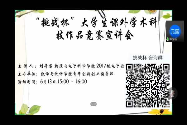 (通讯员 彭章旭 郑胜)6月13日下午,数学与统计学院(以下简称“数统院”)于线上开展“挑战杯”大学生课外学术科技作品竞赛宣讲会。此次宣讲会由数统院青年创新创业指导部(以下简称“青创部”)主办,青创部干事邓元园主持,物理与电子科学学院2017级电子班学生刘卉君担任宣讲人。
