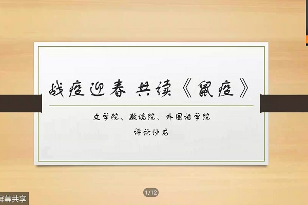 (通讯员 章寒露 郑胜)9月17日中午,数学与统计学院(以下简称“数统院”)青年传媒中心文艺评论部联合文学院、外国语学院文评部举办主题为“战疫迎春,共读《鼠疫》”的线上评论沙龙会。此次评论沙龙结合时事,通过讲解经典名著《鼠疫》,引导评论员发表对新冠病毒事件的看法,思考人与自然的关系。