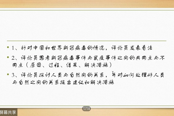 新冠疫情爆发后的短暂时间内,中国政府采取紧急应对措施,以积极的态度应对病毒,在疫情防控方面取得了巨大成效。针对中国和世界各国的抗疫情况,各评论员发表看法。外国语学院陈美钰表示,此次疫情让她感受到了中国人民的团结与中国特色社会主义的优点。数统院凌欣与其他同学对比新冠事件与鼠疫事件,认为初期人们推卸责任是两个事件的共同点,但不同的是,鼠疫事件中人们求助于宗教,而中国疫情防控取得成果则归功于政府的统筹规划及民众对政府的信任。