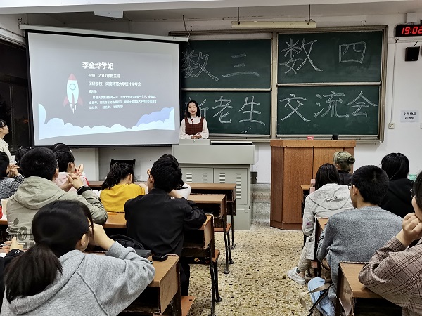 新老生交流会于晚自习时开始,由各班班导统筹负责,形式多样、侧重点各不相同。交流会由经验分享和提问答疑两个环节组成。受邀学生代表依次就学习、工作、教师技能和生活经历分享了经验,着重强调了培养良好学习习惯以及提高个人能力的重要性。他们鼓励新生们努力学习、开阔视野、全面提高自己的综合水平,并寄语新生,在参与学生工作的同时统筹兼顾好自己的学习。同时,他们就数学专业知识的学习分享了学习方法,针对不同的发展方向提出了适宜的学习建议。