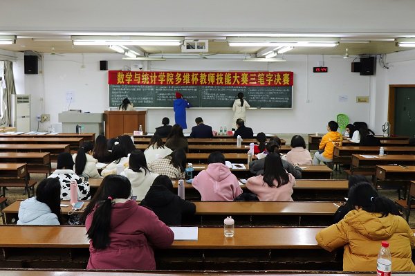 (通讯员 彭承清 钱昱锦 穆文卿)为进一步加强师范生教师职业技能的培养,提高师范生的教育教学能力,增强师范生就业竞争力。12月10日下午,数学与统计学院(以下称“数统院”)于格物楼409教室举行“多维杯”教师技能大赛三笔字决赛。此次比赛由我校招生与就业指导处副处长周俊老师,数统院副院长高其举老师,数学系老师吴郁兰老师担任评委。数统院2019级辅导员杜涛老师主持比赛。