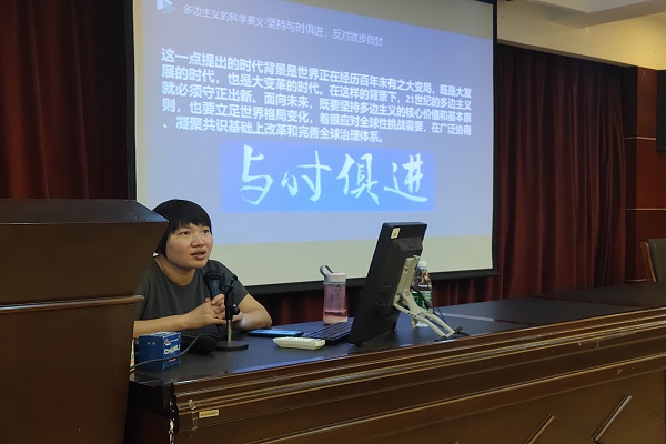 课程上,丁建军从多边主义的内容、重要性以及现实困境三个方面进行讲解。首先,她以新冠肺炎疫情时期中美对医疗物资供应的不同态度为例,详叙“多边主义”与“本国优先的多边主义”的区别,批判美国保护主义政策。同时,丁建军引用习近平总书记的发言,强调坚持共商共建共享原则与真正的多边主义,维护以世界贸易组织为核心的多边贸易体制的重要性。最后,丁建军介绍我国在新时代践行多边主义的具体措施,她认为,“一带一路”正是我国践行多边主义外交的实际行动,体现出我国相互尊重、平等互利、和平共处的外交战略。