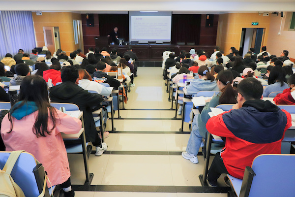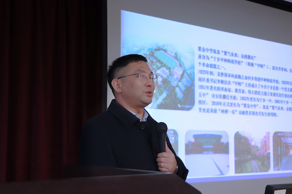 潘道正阐述紫金中学的校史校训、办学理念,并欢迎数统院2019级学生前往紫金中学实习。他以自身求学与教学经历为切入点,介绍“青年教师的五好工程”、“青年教师的必备品质”、“青年教师的八大修炼”三方面内容。他表示,青年教师进入学校之初应多听课,多记录,经常与老教师交流讨论,提升课堂教学效果。同时,青年教师应秉持勤恳好学的态度,常怀敬畏之心,把握赛课、外出学习、论文等多种机会,沉淀个人能力。潘道正以具体教学案例引入,强调优秀教师应当善于学习、勤于反思,及时做出行动改进方案,提高自身专业素养,并鼓励教师坚持八大教学原则,时刻铭记教书育人的使命。