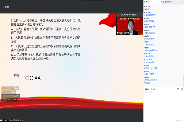 主讲人陈紫若从全面内战的背景出发,阐述了解放战争中中国共产党和中国共青团的艰苦奋斗历程,通过三大战役的巨大胜利,指出了中国共产党代表着最广大人民群众的根本利益,党与人民一体同心、休戚与共。回顾新中国成立后在党领导下的两个重要历史时期,主讲人何婷婷罗列了社会主义建设的实践探索时期中所取得的伟大成就,提出了党领导的革命、建设、改革,是一脉相承、生生不息的壮丽事业。主讲人梁群琦则紧扣时政,围绕经济与科技发展,展示了新中国在两个领域的特点和成果,述说了习近平主席对当下新中国的发展与展望,强调新时代青年要担当起民族复兴的伟大使命。在会议过程中,三位主讲人均设置了党史知识问答环节,与会人员积极参与。