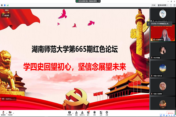 (通讯员 张艳鑫 何粤)5月5日中午,数学与统计学院团支部以线上会议的形式开展第665期红色论坛。此次论坛以“回顾百年奋斗史,携手奋进新征程”为主题。数统院党委副书记涂榉耀、团委副书记肖惠卿、2018级辅导员李俐和2021级辅导员周逸出席此次活动。