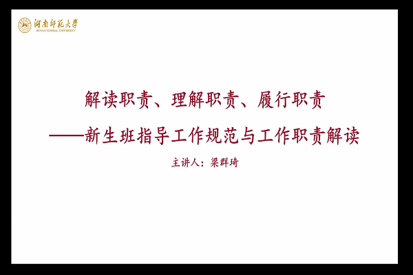 (通讯员 张艳鑫 石卓)6月25日上午,为帮助新一届班指导解读和履行职责,数学与统计学院(以下简称“数统院”)于线上举行2022级新生班指导岗前培训会。21级公费师范生一班班指导梁群琦担任主讲人。2020级辅导员熊密密参加此次会议。