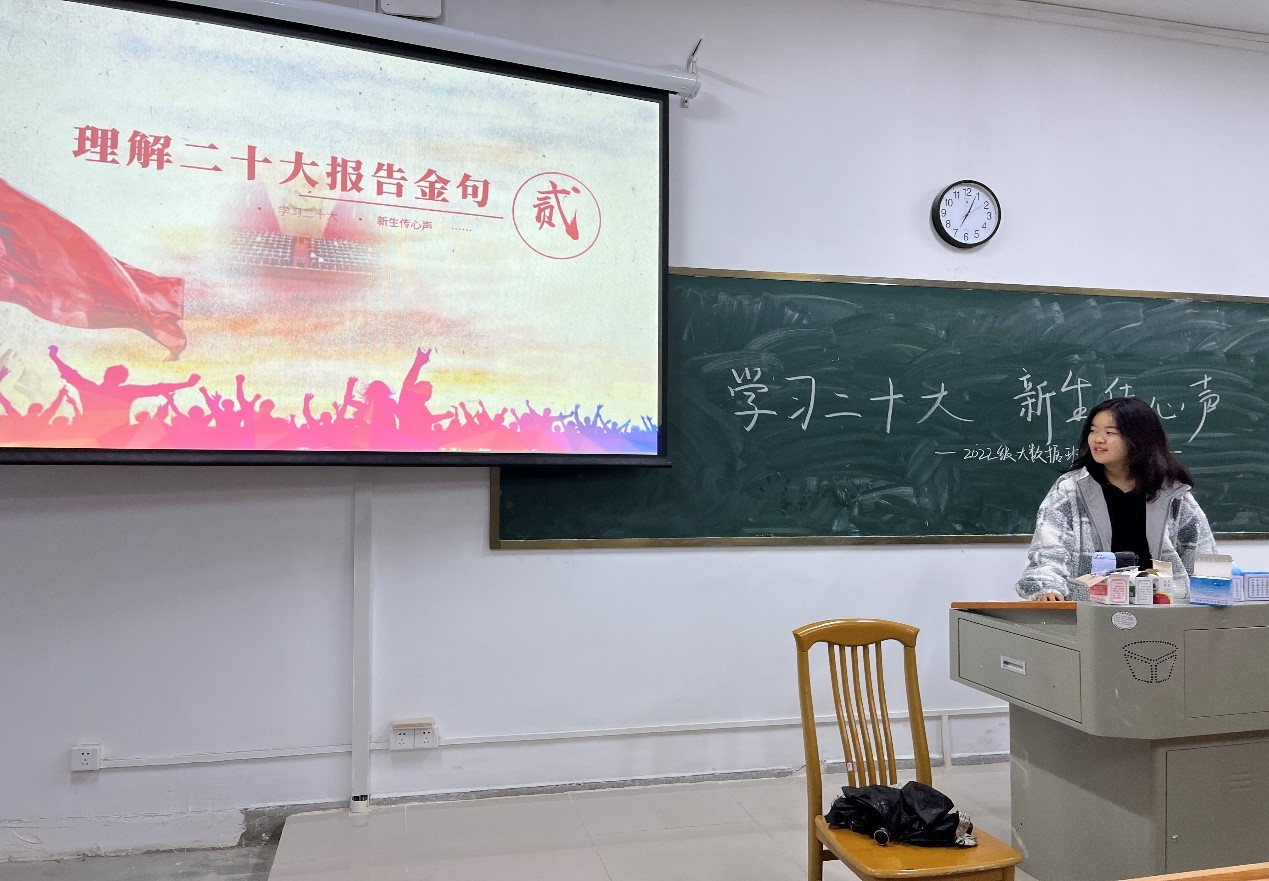 (通讯员 吕倚影 安羿瑾)11月18日下午,数学与统计学院(以下简称“数统院”)2022级大数据班于咸嘉湖图书馆201教室举行了以“学习二十大新生传心声”主题团日活动,团日活动由22级大数据班团支书喻泊晟主持,大数据班全体学生参加此次团日活动。
