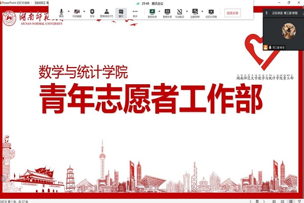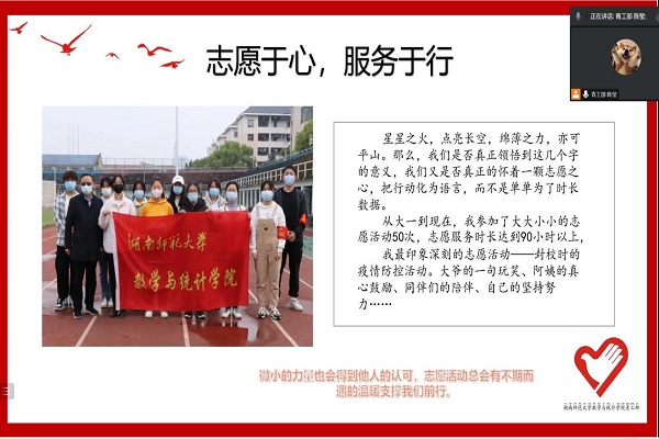 (通讯员 颜永杰 石卓)为广泛传播志愿者精神,深度思考领悟青年担当,12月7日晚,数学与统计学院(以下简称“数统院”)团委青年志愿工作部(以下简称“青工部”)组织开展“微光成炬,爱映山河”志愿者宣讲会。数统院团委指导老师、2019级辅导员肖惠卿参加此次活动。数统院2020级统计班周逸菲、2021级大数据班陈莹、2021级数二班陈佳鑫担任主讲人。数统院学生会文艺部负责人邓晓添担任主持人。