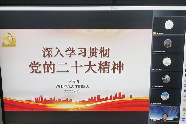 (通讯员 郭校语 石卓)12月13日晚,数学与统计学院(以下简称“数统院”)开展了“深入学习贯彻党的二十大精神”为主题的形势与政策专题教育课程。我校副校长谢资清教授担任主讲人。数统院专职组织员覃志斌出席此次讲座。此次讲座由数统院2022级新生辅导员李师澳主持。