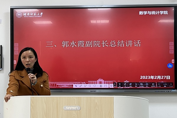 (通讯员 蒲佳莹 曾轩普 石卓)2月27日下午,数学与统计学院(以下简称“数统院”)于格物楼409教室召开2019级数学班实习总结大会。数统院副院长郭水霞、数学系副主任袁智强出席此次会议,2019级学生辅导员肖惠卿参加会议。2022级数四班张淑贤担任主讲人。