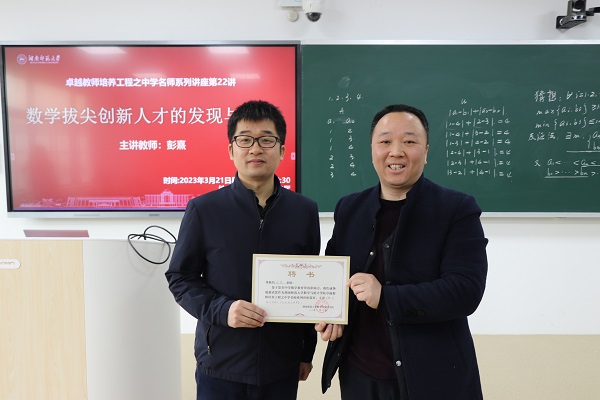 (通讯员 郭校语 高俊威 曹慧娟)3月21日上午,数学与统计学院(以下简称“数统院”)于格物楼409报告厅举办“卓越教师培养工程”之中学名师系列讲座第二十二讲。此次讲座以“数学拔尖创新人才的发现与培养”为主题,长沙市雅礼中学数学教研组长、数学竞赛主教练彭熹担任主讲人。数统院数学系副主任袁智强出席此次讲座。