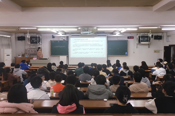 讲座包含数学竞赛的起源、题目特点、相关政策三个方面。崔登兰简要概述数学竞赛的起源与发展,介绍了我校数统院在竞赛获奖上从无到有。就题目特点方面,崔登兰详细讲解了高代、数分、空解的备考提纲,使同学们提前了解到考题内容。她概述了我校数学竞赛的鼓励政策,以激发学生们对数学竞赛的热情。最后,崔登兰向同学们推荐几种校赛培训参考书,并介绍了正式比赛的场地。