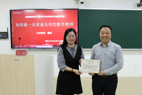 (通讯员 唐亘嫣 高俊威 张艳鑫)3月31日下午,数学与统计学院(以下简称“数统院”)于格物楼409学术报告厅开展“卓越教师培养工程”之中学名师系列讲座第二十三讲,主题为“如何做一名前途光明,幸福快乐的数学教师”,由湖南师大附中博才实验中学教学副校长,中学数学正高级教师曾辉担任主讲人,数统院数学系副主任袁智强出席此次讲座。