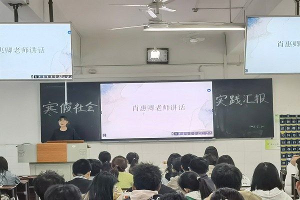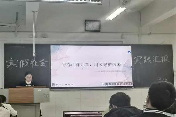 随后,部分寒期社会实践活动负责人依次汇报活动成果,实践优秀代表阐述实践经历、分享实践感受。其中,“青春湘伴·用爱守护未来”教育关爱活动负责人陈佳鑫介绍了活动的前期流程、具体内容、后期成果,并展示此次教育关爱活动的总结视频。
