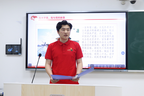 黄佳木以自身经历为切入点,鼓励同学们重视专业课程学习的同时,多参与课外活动来丰富自己的大学生活。此外,他强调,在面临抉择时大家要学会权衡利弊,做出正确的选择。赵颂从党的发展历程引进,展现了党的艰难发展史。同时,他以自身为例,介绍了自己的志愿活动经历,表达了他对中国共产党的崇高敬意。李一萌分享自己三下乡的感悟,强调了信念的重要作用。她带领学生们探讨新时代青年的奋斗方向,希望大家牢记党的纲领,树立远大理想、努力奋斗,担当起时代责任。