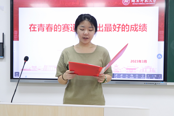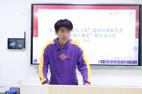 (通讯员 唐亘嫣 谭湘玉 张艳鑫)4月18日晚,数学与统计学院(以下简称“数统院”)于格物楼409教室召开“湖南师范大学优秀大学生学习贯彻党的二十大精神”宣讲会,由数统院2019级数学与应用数学专业黄佳木,2020级数学与应用数学专业李一萌,公共管理学院2020级行政管理专业赵颂担任主讲人。2022级辅导员李师澳参加此次宣讲会。
