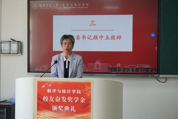 颜中玉致辞。她介绍到,校友奋发奖学金由数学系1981级校友周玉波等人于2005年倡导发起,旨在勉励数统院学子秉承“仁爱精勤”的校训精神。她对数统院优秀校友此次的捐赠以及近年来对我院的支持表达感谢,并对获得奖学金的同学并给予高度肯定。她表示,奋发奖学金是历代校友对母院的回馈,希望数统院学子怀揣感恩之心,努力学习,拼搏进取。