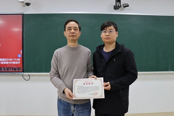 讲座结束后,蒋培杰为赵优良颁发证书并合影留念。