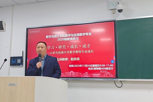 (通讯员 曹慧娟 邓璟森 蒲佳莹)11月24日上午,数学与统计学院(以下简称“数统院”)于格物楼409报告厅举行“学习·研究·成长·成才——让研究助推中学数学教师专业成长”主题教育讲座,湖南师大附中学术委员会主任、湖南省特级教师赵优良担任主讲人,数统院数学系副主任袁智强、数学教育教研室主任蒋培杰、2020级数学与应用数学专业全体学生参加此次讲座。