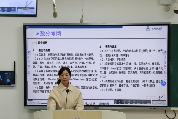 崔登兰简要介绍了数学竞赛的成立背景以及各发展阶段,并介绍了正式比赛的场地及其规模,同时也分享了我校在该竞赛曾获得的奖项。就题目特点与考纲方面,她详细讲解了高等代数、数学分析、空间解析几何的备考提纲,并提醒有参赛意向的同学们提前了解到考题内容。此外,崔登兰概述了我校对于数学竞赛的鼓励政策,以激发学生们对数学竞赛的热情。最后,她向同学们推荐有关校赛培训的参考书目,并呼吁学生们踊跃报名参与数学竞赛。