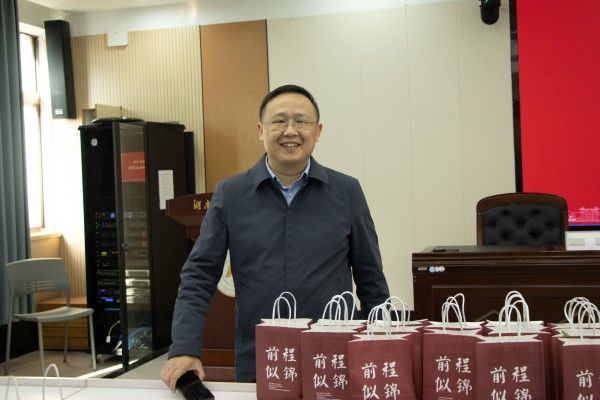 备考后期正是倦怠期,为了鼓舞人心、缓解压力,学院为同学们准备了印有“前程似锦”字样的礼物袋,以及写有每位学生姓名的专属祝福明信片。每一份小礼物都寄托着美好的祝愿,其中的“柿柿如意”挂件寓意着“考研顺利”,旺仔牛奶寓意着“考研旺旺”。大会最后,全体与会人员在会场坐席上做出大拇指手势合影。