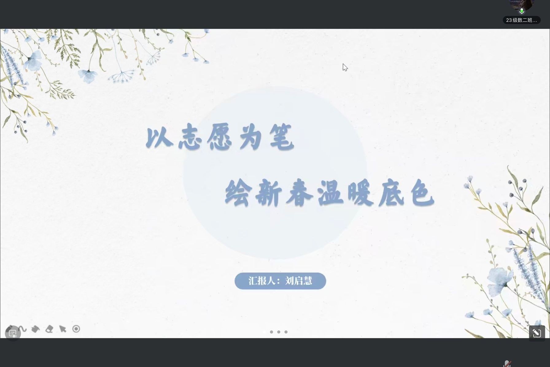 在“以志愿为笔,绘新春温暖底色”主题汇报中,主讲人刘启慧分享了她在社区帮扶老人、关爱儿童的经历,体现了青年学子实际行动传递温暖的精神。活动中,同学们通过交流志愿服务案例,体会到“奉献中成长、温暖中前行”的意义。大家纷纷表示,将继续以志愿精神为纽带,为社会注入更多青春力量。