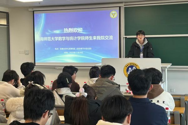 (通讯员 罗雨函 江睿捷 刘芮莹)11月28日下午,数学与统计学院(以下简称“数统院”)赴沪宁访学团(以下简称“访学团”)与东南大学数学学院(以下简称“东南数院”)于东南大学九龙湖校区综合楼512咏论堂和704会议室开展数学拔尖人才培养计划交流日活动。