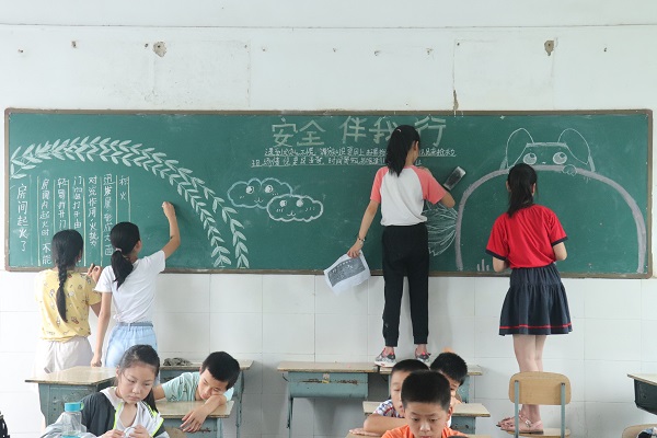 (通讯员 李爽 陈思兵)7月12日,数学与统计学院(以下简称“数统院”)青年传媒中心赴长沙市望城区茶亭镇茶亭小学第七季暑期社会实践团于各年级开展黑板报活动。此次黑板报活动将由各班班主任组织学生共同完成,夏令营活动拟开展两次班级黑板报活动,此次黑板报的主题为安全知识教育。