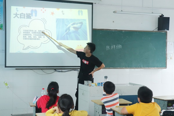 陈梓鹏就海洋是什么对同学们进行了提问,同学们展开想象,回答提出的问题。之后,他从神奇的海洋动物和海洋世界传说两个方面为同学们详细介绍了海洋。在陈梓鹏的带领下,同学们认识了飞鱼、金枪鱼、旗鱼、大白鲨等海洋动物,并通过图片了解到它们的特征。接下来,陈梓鹏带领同学们欣赏了有关大白鲨的视频,他说,同学们都认真地看完了视频,并表示自己一定会保护好海洋的环境,让动物们安全地生存。