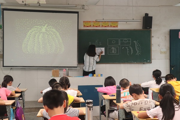 课程开始之前,晋雨晴就身边有哪些用圆点装饰的东西对全体同学进行了提问,同学们积极回应,给出了足球,七星瓢虫等答案。根据同学们的答案,晋雨晴向同学们介绍了以圆点作画的代表画家草间弥生,并向同学们展示了一些草间弥生的代表作品。本次绘画课程的主题是模仿草间弥生的南瓜。她将整个作画步骤分为准备材料、构思、铅笔起稿、检查上色四个部分。在作画过程中,她对同学们出现的问题及时的进行了纠正。下课时,同学们都完成并呈交了自己的绘画作品。