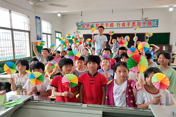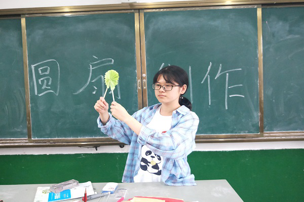 该日上午,熊雨虹和尹娇分别在高低年级教授了圆扇的制作,老师们提前备好课件和教学用品,学生们认真听讲,跟随老师的教学步骤,很好地完成了圆扇的制作,老师对作品完成出色的同学进行了奖励。