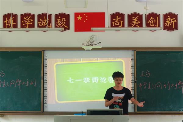 在由实践团队员担任的主持人宣布规则后,各辩手按顺序自我介绍并向评委、观众问好。针对“中学生上网利大于弊还是弊大于利”的辩题,正反方辩手你来我往,相互间进行了激烈的交锋。在自由辩论环节更是将比赛气氛推向高潮,现场观众掌声不断。比赛结束后,每班评委根据辩手的辩论情况逐一给予公正的点评,并投票评选出获胜队伍及最佳辩手。