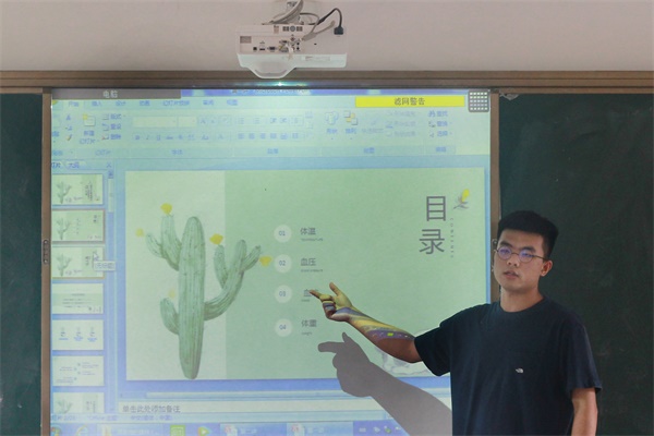 周浩然将课程分成四部分,分别是体温、血压、血液以及体重。他指出人体的体温在不同测量部位是有差异的,正常体温会在小范围内波动,在介绍完水银温度计、数字式电子体温计、医用红外线体温计这三种体温计后,他用水银温度计给主动接受测量的学生量体温。在血压部分,周浩然详细阐释了收缩压和舒张压,并示范用血压计测量血压。在示范过程中,他着重强调了袖带绑的位置和肱动脉的位置。随后简要介绍了血液的组成成分,周浩然结合自己的献血经历提醒学生们献血的注意事项。