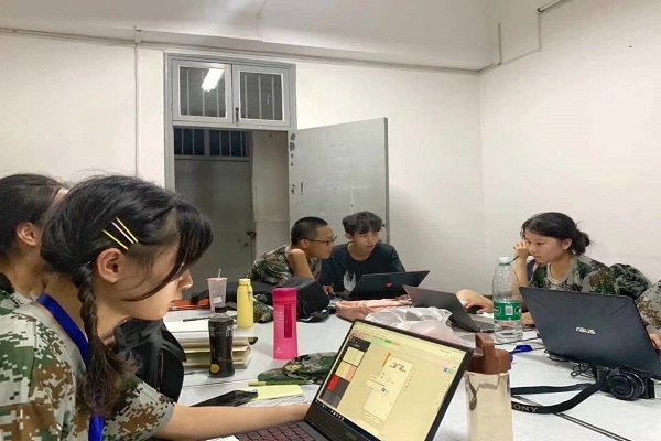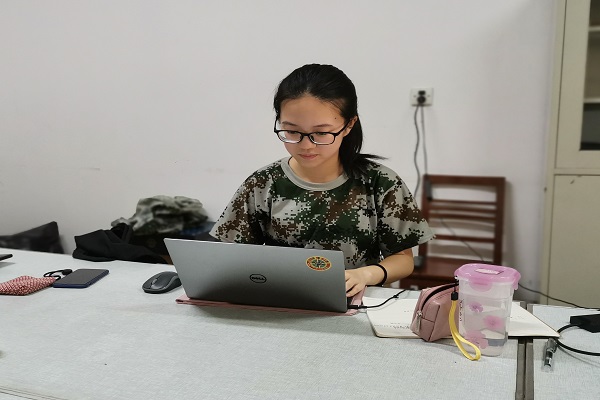 在国际学术报告厅一楼团委办公室里,聚集了十一位军训特刊小队成员。由于职责分块的不同,整日待在团办幕后书写新闻稿的是六位新闻组的同学。他们是信息班的朱禹硕,统计班的章寒露、茹晓芝和数学班的穆文卿、周胤梓、王伟华。穆文卿指出,在面对稿件里出现的错误时,她也会有些无措。尽管如此,她依然会尽心修改文稿,进一步提高对新闻稿形式内容的熟练度。并且,在第二日的早晨,当她将写好、改好的稿子发布到数计之家官网上的时候,她感受到更多的是骄傲。