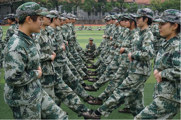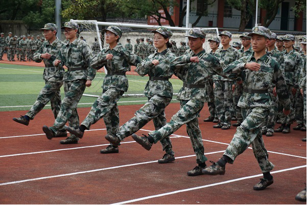 方阵在三名教官的带领下,分别开始训练。今日训练的主要内容是踢正步。为了使同学们动作标准,教官采取定手、定腿等训练方法。在训练过程中,教官选择特定的音乐播放以缓解同学训练的疲劳感。据方阵中的同学介绍,教官播放了“你笑起来真好看”,“军中绿花”,“强军战歌”等富有特色,节奏欢快的歌曲,他们伴着歌声进行训练。