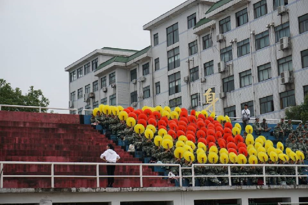 为检验特色方阵训练效果,增强展示效果,新生提前进行彩排。经过多次练习与调整完善,特色方阵字样整齐明显,变形迅速,动作整齐。