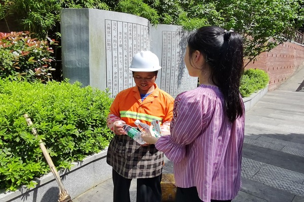 志愿者们集合后,按照负责人的安排分成两组,分别前往桃子湖路口和学堂坡小区开展志愿活动。他们带上足量的矿泉水,沿途分发给正在工作的环卫工人,为在高温下坚守的他们送去一丝清凉,感谢他们对城市卫生所做出的贡献。同时,志愿者们还询问了环卫工人的工作情况,提醒他们做好防暑措施。志愿者们了解到,环卫工人下午的工作从2:00开始,在一天中最热的时候,巡视、清理街道上的垃圾,负责道路的清洁工作。