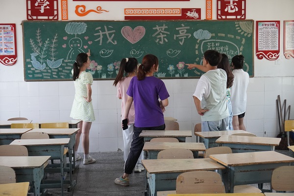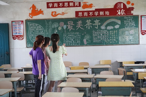 (通讯员 刘海林 付潇靓 梁群琦)7月11日下午,湖南师范大学数学与统计学院(以下简称“数统院”)团委赴长沙市望城区茶亭镇茶亭小学第八季暑期社会实践团(以下简称“茶亭同行”)进行黑板报比赛评比,担任本次比赛评比的评委为实践团队长、副队长,以及实践团各组的组长。其中,“茶亭同行”队长梁群琦为主评委。
