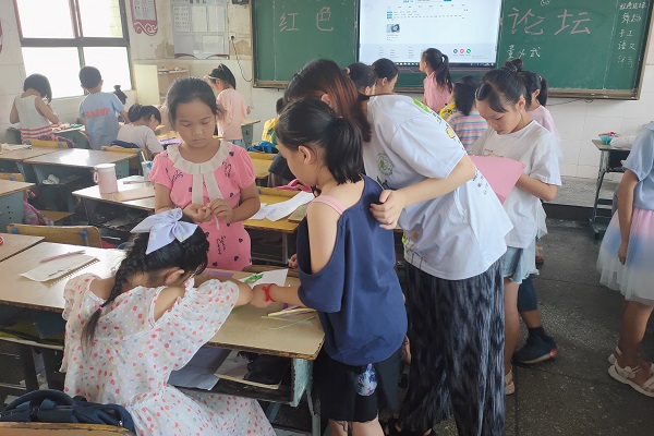 (通讯员 姚程 付潇靓 梁群琦)7月12日上午,湖南师范大学数学与统计学院团委赴长沙市望城区茶亭镇暑期社会实践团(以下简称“茶亭同行”)组织茶亭小学四年级全体学生制作立体卡。茶亭同行队员张璐负责此次活动。