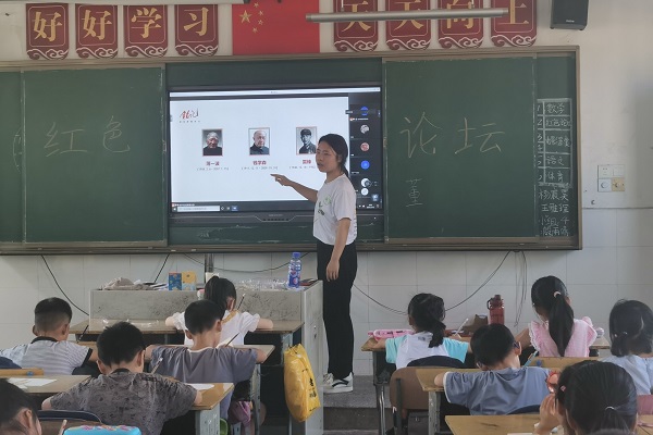 谢梦瑶首先向学生介绍党史人物的含义。并分别从领袖人物、先驱人物、功勋人物、英烈人物四个方面进行讲解,带领学生认识了毛泽东、周恩来、陈独秀、钱学森、杨靖宇等英雄人物和他们的重要事迹。主讲人每讲解一位党史人物,学生便拿出纸和笔记下他们的名字。接下来是红色论坛第二部分:重温红色经典故事。谢梦瑶向全体学生着重讲述了小兵张嘎和狼牙山五壮士的英勇故事,各班学生在班主任的带领下,认真聆听,学习感受他们的爱国热情和宁死不屈的精神。