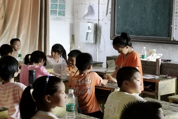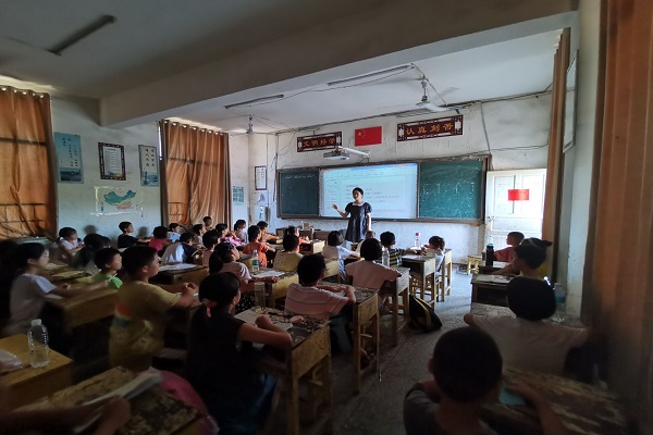 (通讯员 钟思颖 曾皓楠)7月15日,为增强学生对英语的学习兴趣,传承红色基因,湖南师范大学数学与统计学院(以下简称“数统院”)青年传媒中心赴邵阳市绥宁县黄土矿镇暑期社会实践团成员蒋亚男于黄土矿镇学校教室展开英语趣味游戏。