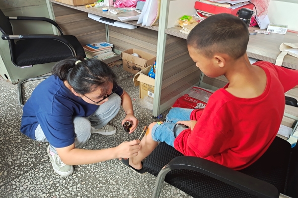 (通讯员 王灵凤 曾皓楠)7月13日,湖南师范大学数学与统计学院(以下简称“数统院”)青年传媒中心赴邵阳市绥宁县暑期实践团(以下简称“实践团”)于黄土矿镇学校教师办公室为学生处理伤口。五年级班主任旷颖负责处理此次事件。