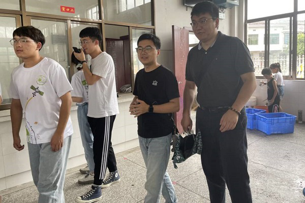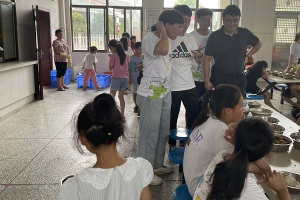 (通讯员 刘海林 付潇靓 梁群琦)7月19日中午,湖南师范大学数学与统计学院(以下简称“数统院”)团委书记杜涛老师、数统院第十八届学生社团管理服务中心主任周子鹏、数统院2021年级辅导员周逸老师前往茶亭镇茶亭小学视察食堂卫生工作。此次活动的主要负责人为实践团成员梁群琦。