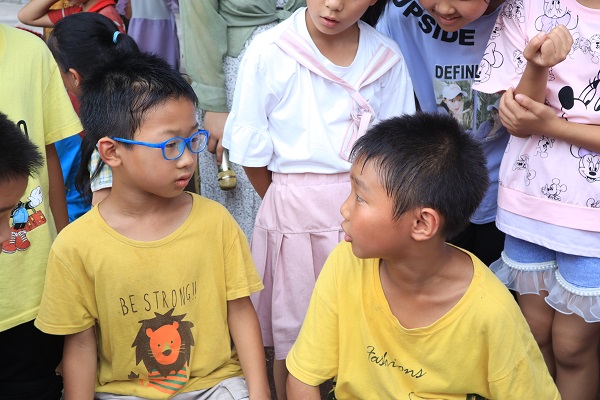 为了帮助学生更快的地适应比赛,实践团队员们为学生们演示比赛规则:前一个学生向后一个学生喊出“九九乘法表呀——四六”,后一位学生回答正确后再对下一个人出题,回答错误的学生淘汰,依次循环直至赛场上仅剩两名选手。参赛选手一个个摩拳擦掌、热情高涨,反复背诵九九乘法表的内容。比赛开始,选手们高度集中注意力,大脑飞速运转,啦啦队员也不甘示弱,不停为选手加油助威。初赛过后,四名选手进入决赛,新一轮比赛开启。经过激烈的角逐,袁诗辄、彭湛和袁权三名学生获得最终的胜利。在记者的采访中,三名学生表示,获胜的秘诀就在于对九九乘法表这类基础知识要倒背如流,比赛时保持心态平和也很重要。