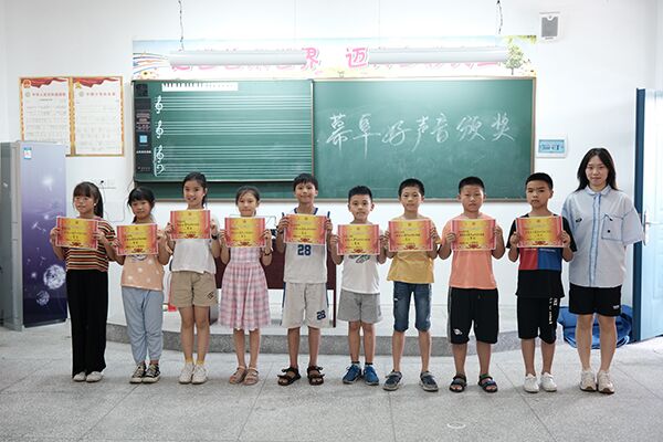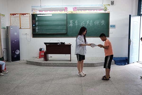 “幕阜好声音”歌唱比赛颁奖典礼于余坪中心小学的音乐教室举行,此次颁奖典礼由素拓组组长张译心主持。她表示,举办颁奖典礼不仅是为了给予热爱音乐且敢于表现自己的同学们的鼓励和肯定,满足他们的成就感和自豪感,激发出足够的信心与动力,坚持自己喜欢的事物且继续为之奋斗,这与“幕阜行旅”队伍调研主题之一“关于农村中小学生人生目标的研究—以岳阳市平江县余坪镇为例”的目的不谋而合;同时,此次活动也能够为没有参与比赛以及在初赛落选的同学的提供一个参考和标杆。由“幕阜行旅”队员担任的评委给各个获奖同学颁发奖状并合影留念。
