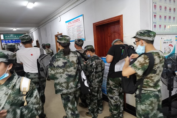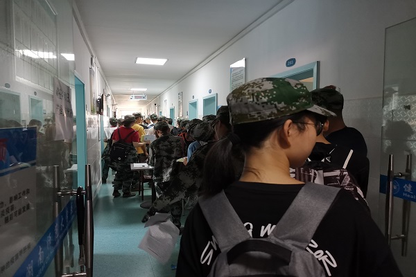 数统院新生在教官及班导的带领下,等待注射甲肝疫苗和乙肝疫苗,并全程配合校医院医务人员的组织,整齐有素进行疫苗注射。在一段时间的等待后,确定身体无误的新生上交体检表,离开校医院。