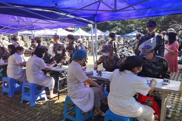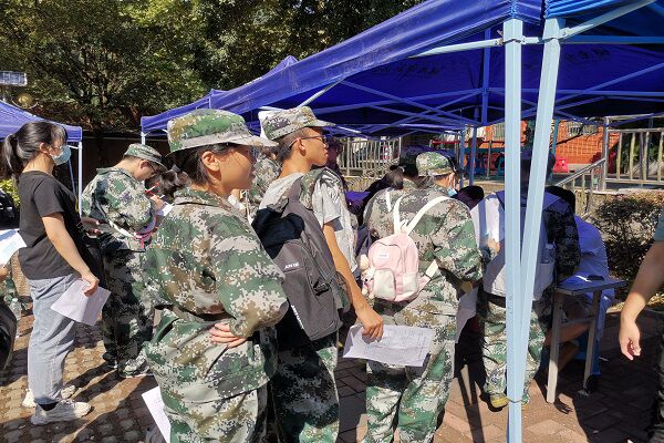 在教官的带领下,2021级新生排着队整齐有序地徒步到达校医院。数统院新生在校医院停车坪等待,医院工作者询问新生是否吃过早餐,提醒新生不能空腹体检。为了不影响血压脉搏测量结果,医生提醒测量的新生放平心态,将电子血压测量仪绑在新生手臂上。测量血压可以筛查高血压和低血压,为新生日常生活中的起居,饮食,用药提供指导。更重要的是,测量血压脉搏可以判断新生是否患有心脏病,预防军训期间某些突发状况的发生。